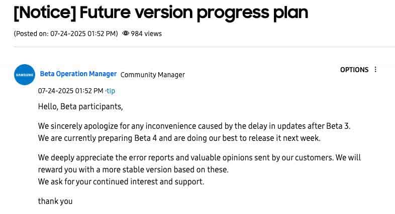 Samsung’un beta programındaki moderatör, One UI 8 Beta 4 sürümünün önümüzdeki hafta yayınlanabileceğini ifade etti. Bu açıklama, kararlı sürümün dağıtımının temmuz sonuna ya da ağustos başına sarkabileceği ihtimalini güçlendiriyor. Hatırlarsan bir önceki beta, yani Beta 3, 30 Haziran’da yayınlanmıştı. İki beta arasında neredeyse bir ay gibi bir gecikme söz konusu.